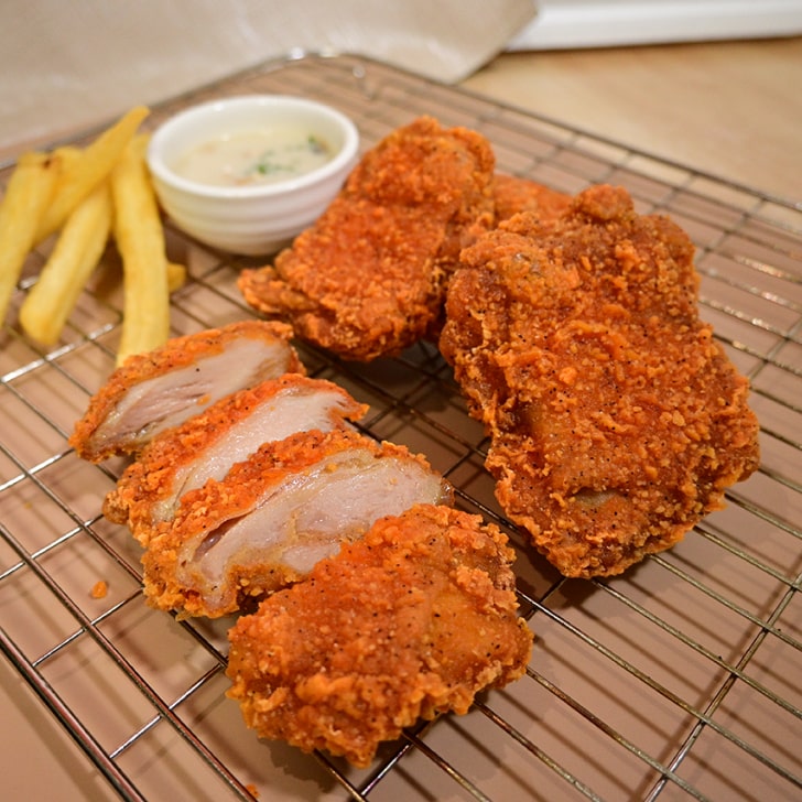 - ชุบแป้งทอดเพื่อให้แป้งเกาะบนเนื้อไก่ แล้วนำไปนึ่งหรืออบให้สุก